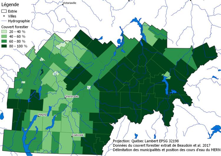 • Compilation des données géospatiales régionales disponibles (cartographie des milieux humides par photo-interprétation, hydrographie des cours d’eau, couvert forestier par télédétection, …) afin de dresser un portrait du terrain à l’étude et d’évaluer le potentiel de milieux sensibles
